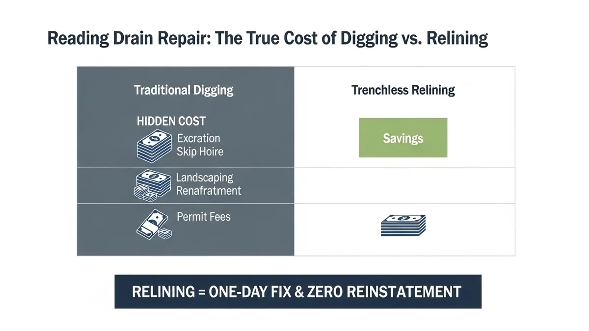 If you wait until the pipe collapses, the cost jumps from a standard £600–£1,200 relining job to a full-scale excavation that can easily exceed £3,000-£5,000, especially if we have to navigate utility lines or reinstate expensive landscaping near Wallington.